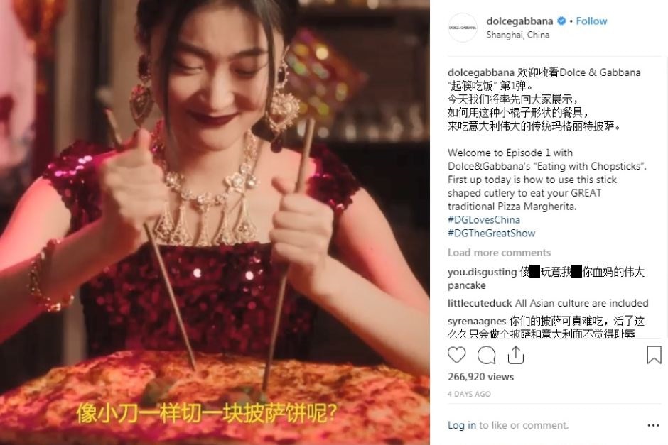 Another brand that came under fire for racism was Dolce & Gabbana. To promote a runway show in Shanghai, the brand released three ads showing a Chinese model attempting to eat Italian food with chopsticks.